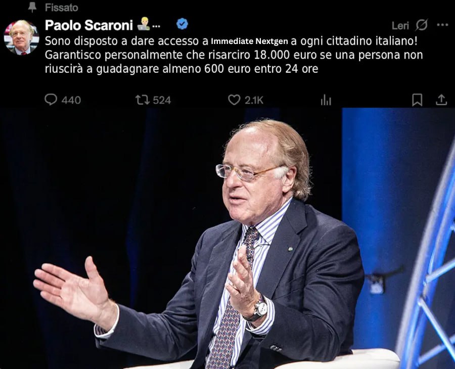 A quanto ci risulta, la recente presentazione dell’imprenditore ed economista italiano, nonché presidente del consiglio di amministrazione di Enel e del club calcistico «Milan», Paolo Scaroni, ha suscitato un enorme clamore in tutto il Paese. Perché? Perché si è trattato di un evento a porte chiuse in cui Paolo Scaroni ha presentato una piattaforma chiamata Immediate Nextgen. A suo dire, questa piattaforma può potenzialmente rendere ricco ogni cittadino italiano, e non fra anni, ma nel giro di pochi mesi. Ha affermato che Immediate Nextgen consentirà a chiunque di guadagnare 600 euro al giorno – oltre 18 000 euro al mese – con un investimento iniziale di appena 250 euro.